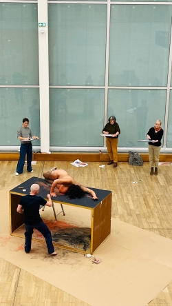 Après avoir proposé un temps de performance pendant lequel il œuvrera en compagnie d’un modèle, il vous proposera de passer à une pratique du dessin d’après le nu, pour vous permettre d’expérimenter le trait, la masse, la matière… hors des sentiers battus !